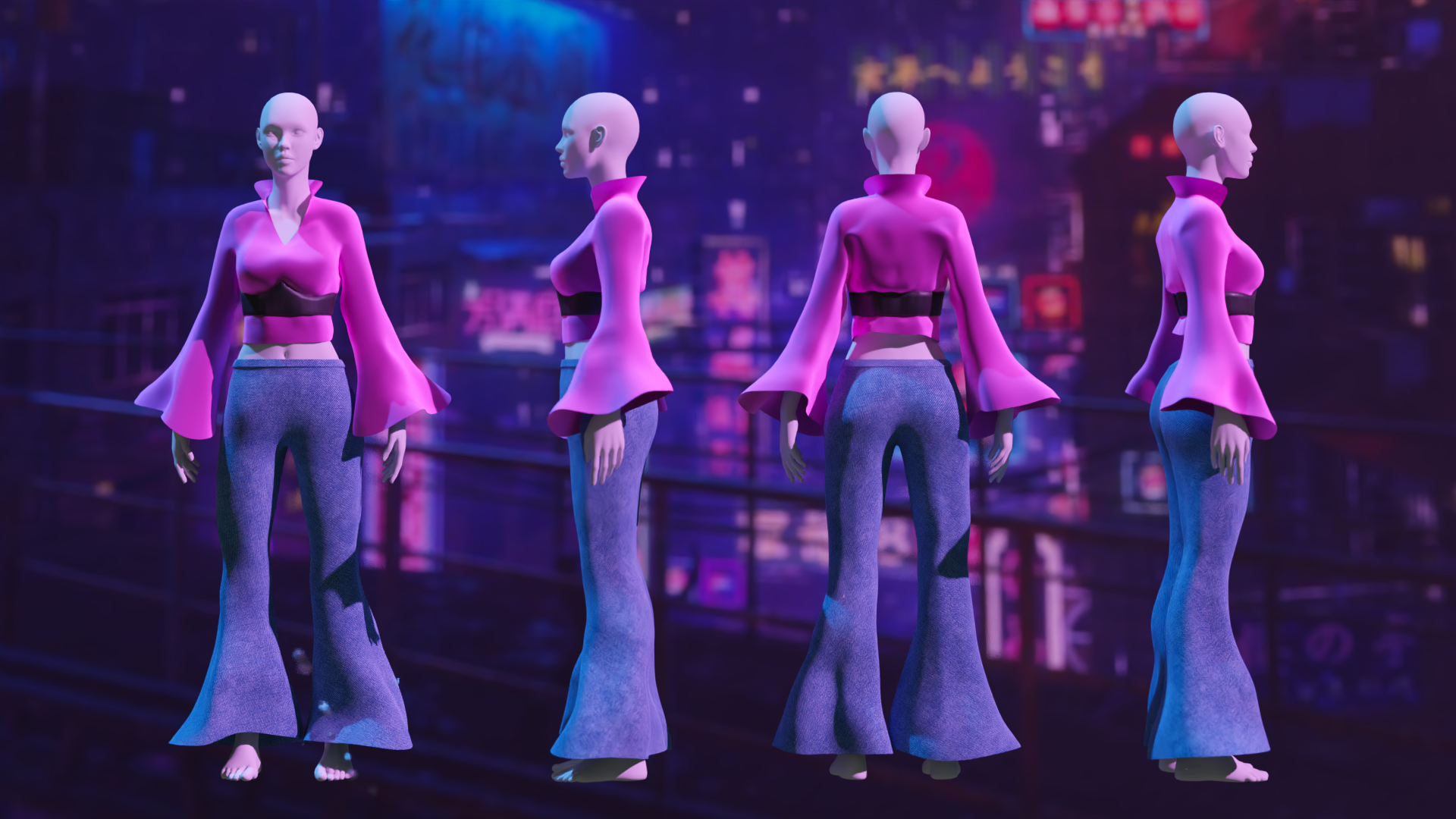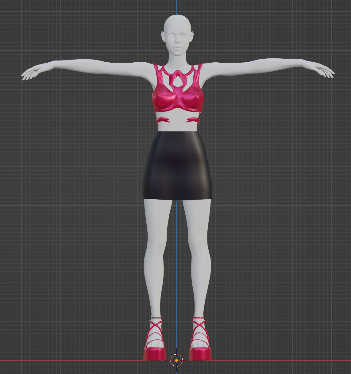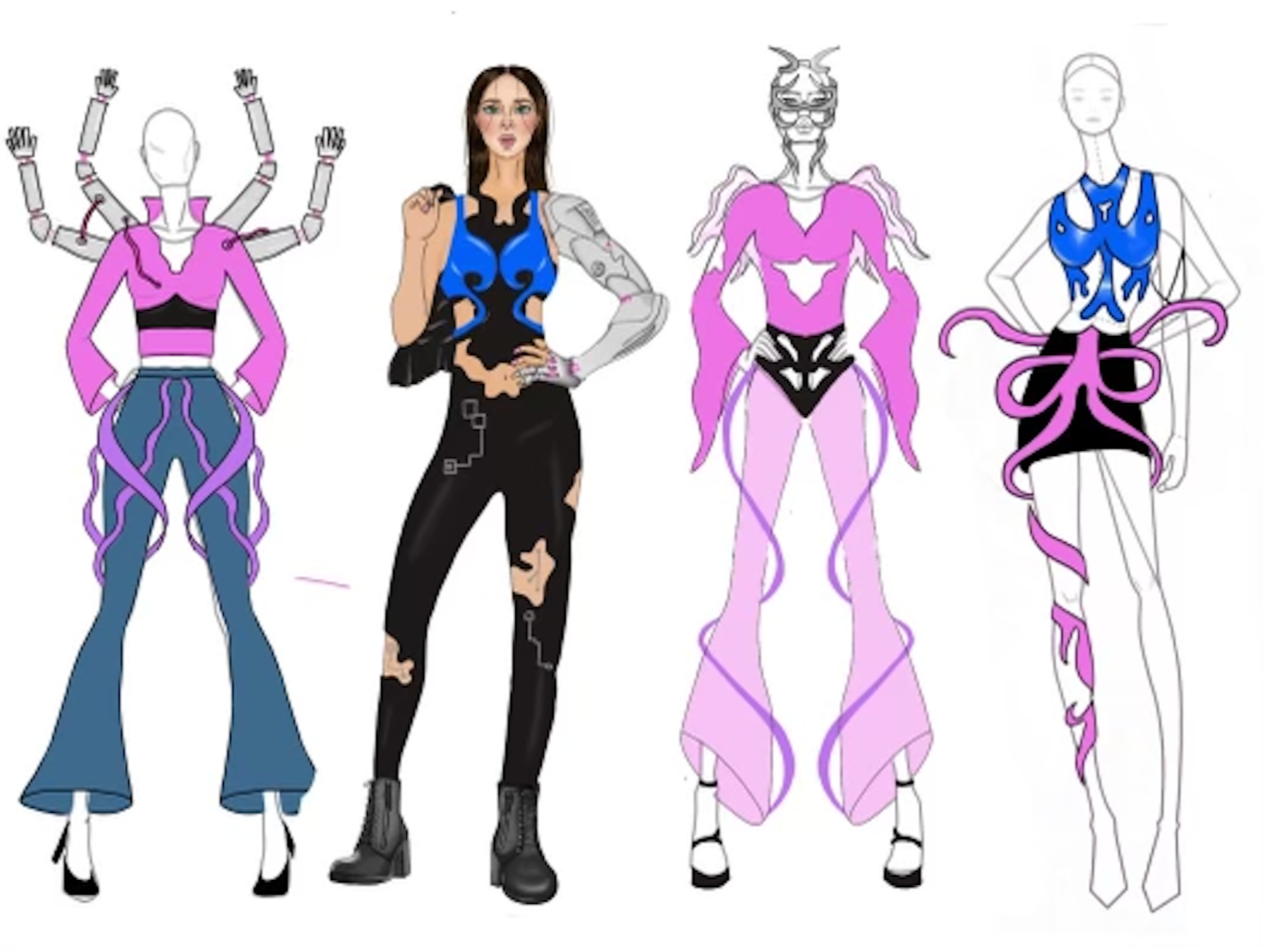 The student provided her sketches and initial outfits for me to 3d model. Most of the final wearables are different due to time constraints and last minute changes on both parties, as both she and I were working simultaneously on our deliverables for this art show. She was heavily inspired by futurism for her fashion line. Her portfolio can be found here